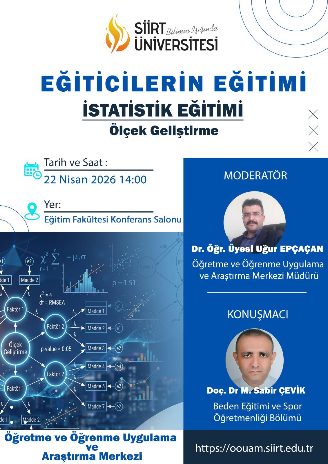 Eğiticilerin eğitimi kapsamında istatistik eğitimi verilecektir. Bu hususta ölçek geliştirme konusu ele alınacaktır. Konuyla ilgili akademik personelimizin katılımı beklenmektedir.
